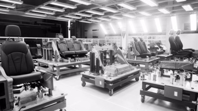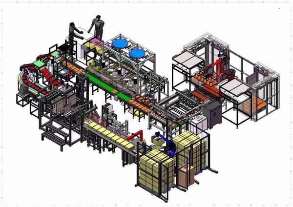 洁净明亮的车间中,工业机器人繁忙地劳作着,AGV小车(自动搬运设备)自动运输着各种原材料。