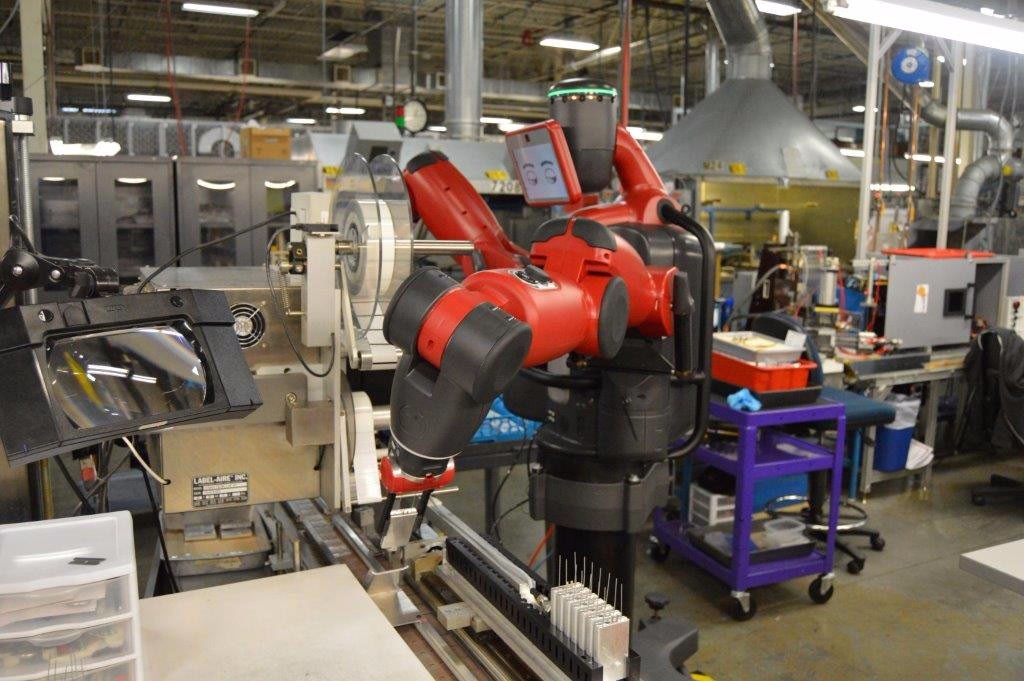 首台Baxter协作机器人应用于抓取任务,将柱状电容器从贴标机器上卸载下来。